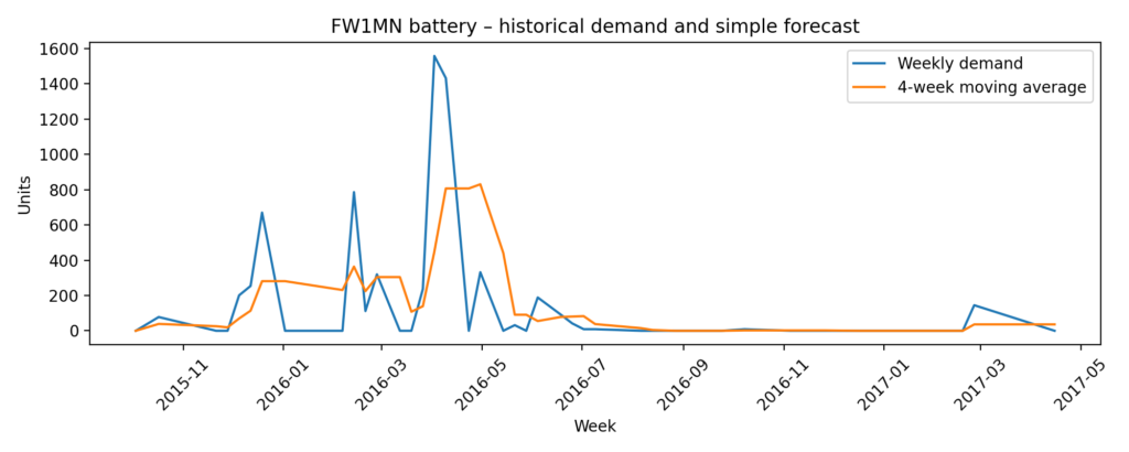 For the FW1MN battery we extract 44 weeks of data and aggregate all channels to a single product-level weekly demand series. Average weekly demand is around 148 units, but the histogram reveals a very irregular pattern: many weeks with zero shipments, punctuated by large spikes above 1,500 units. This “lumpy” demand is typical for spare parts and makes inventory planning more challenging.