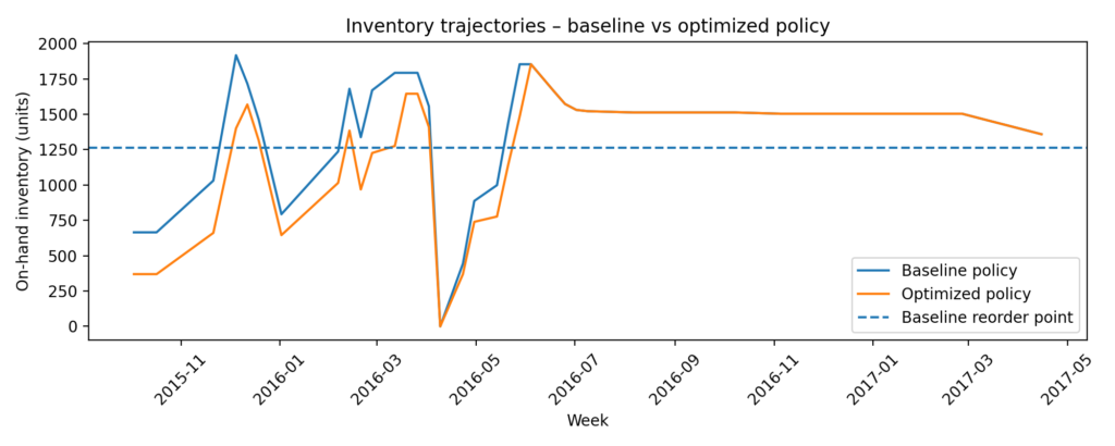 This means the optimized policy reduces average stock by roughly 9%, while sacrificing only about 2 percentage points of simulated service level. In a real multi-SKU portfolio, similar improvements across many items can release a sizable amount of working capital.